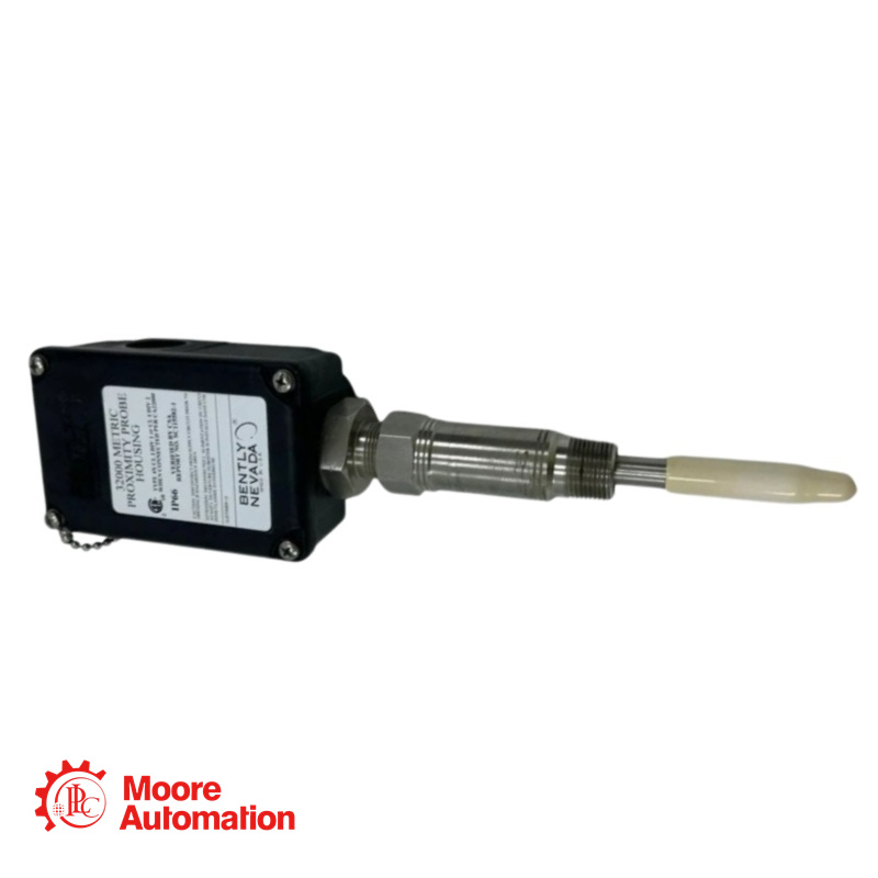 This is a 32000 Proximity Probe Housing Assembly manufactured by Bently Nevada (Baker Hughes). It includes a pre-installed 3300 XL 8 mm proximity probe with a 1.0-meter cable. The assembly is constructed from Polyphenylene Sulfide (PPS) thermoplastic with stainless steel components (AISI 303/304).