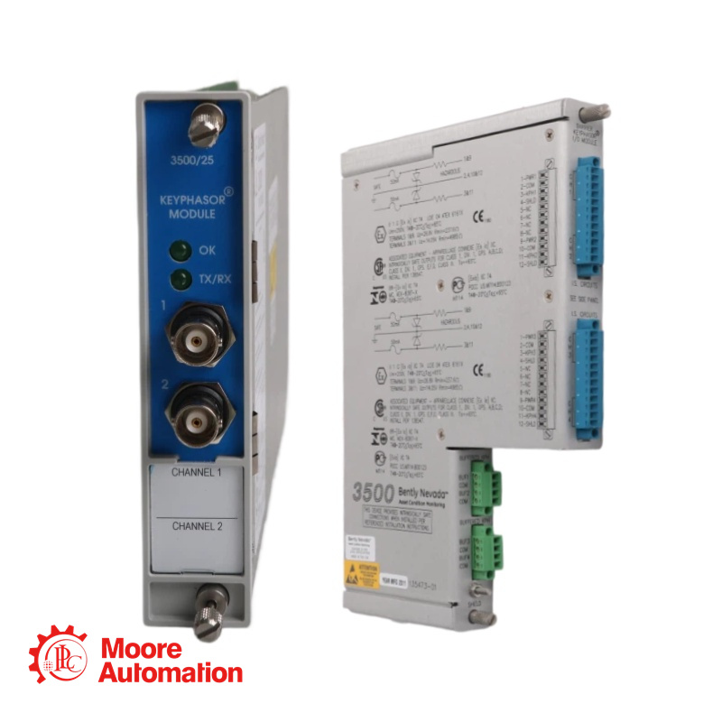 The Bently Nevada 3500/25 Enhanced Keyphasor Module isa half-height, two-channel module used to provide Keyphasor signals to the monitor modules in a 3500 rack. The module receives input signals from proximity probes or magnetic pickups and converts the signals to digital Keyphasor signals that indicate when the Keyphasor mark on the shaft coincides with the Keyphasor transducer. The 3500 Machinery Protection System can accept up to four Keyphasor signals for normal configuration and up to eight Keyphasor signals in a paired configuration.
