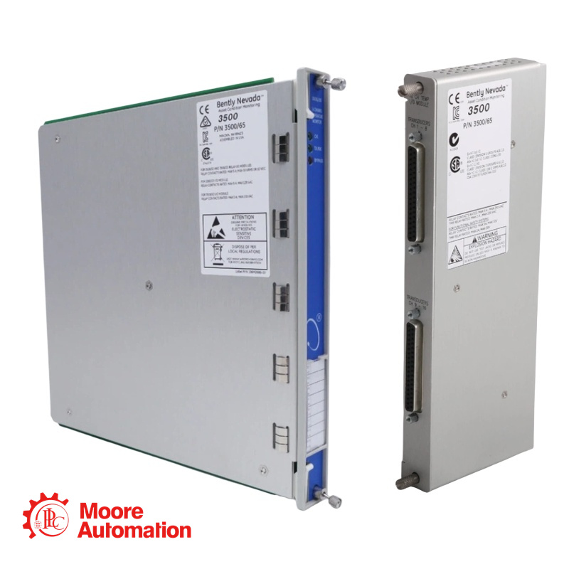 A: The 3500/65 is a 16-channel temperature monitor used in the Bently Nevada 3500 Machinery Protection System. It accepts RTD (Resistance Temperature Detector) and isolated tip thermocouple (TC) inputs. The 172109-01 I/O module provides external terminations for field wiring via separate termination blocks and cables.