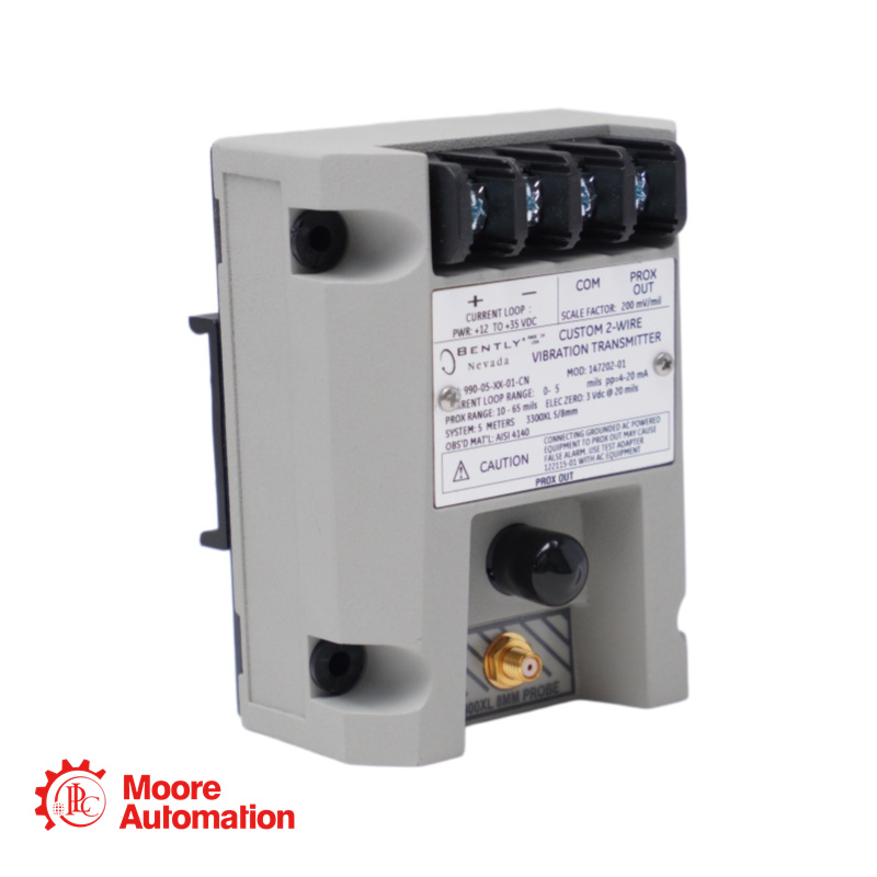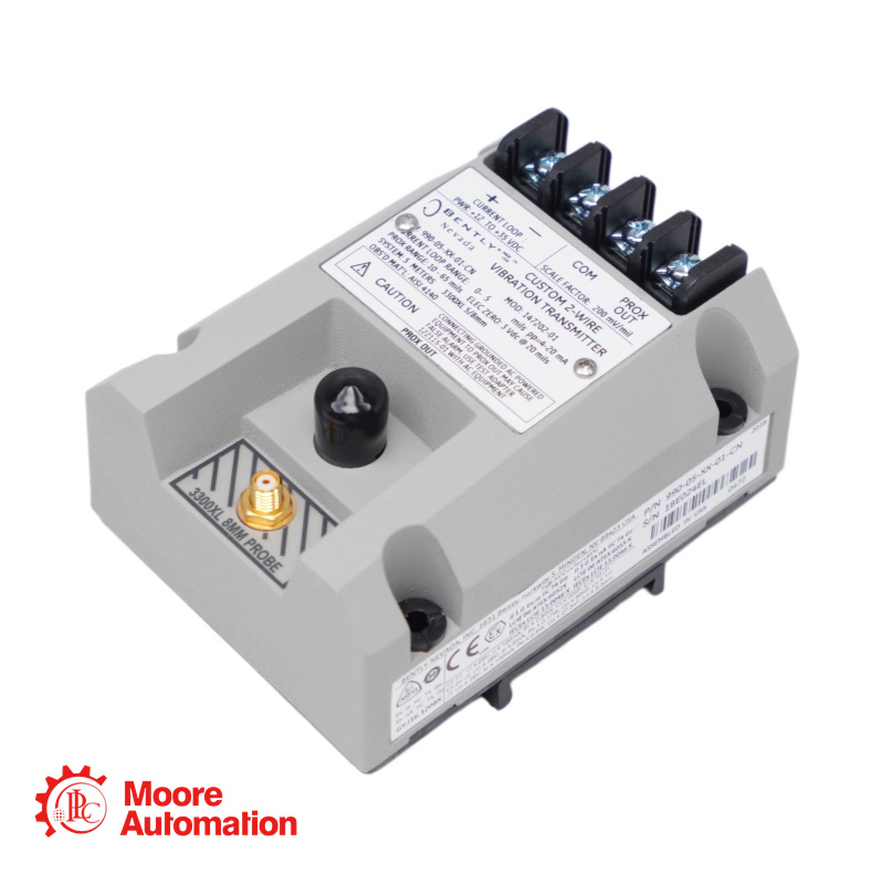 The 990-08-XX-01-CN MOD:163930-02 transmitter is a two-wire, loop-powered device that accepts input from our 3300 NSv proximity probe and its matching extension cable (available in 5 m and 7 m system length options).