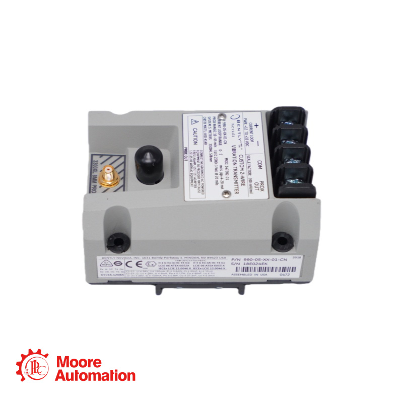 เดอะ 990-04-XX-02-05 MOD:167577-05 ตัวส่งสัญญาณการสั่นสะเทือนเป็นอุปกรณ์แบบ 2 สาย ใช้พลังงานจากวงจรภายใน รับสัญญาณอินพุตจากโพรบตรวจจับระยะใกล้ Bently Nevada รุ่น 3300 NSv และสายต่อขยายที่เข้ากัน (มีให้เลือกความยาว 5 เมตร และ 7 เมตร) ตัวส่งสัญญาณจะปรับสภาพสัญญาณให้เป็นหน่วยทางวิศวกรรมของความแรงสั่นสะเทือนแบบพีคต่อพีคที่เหมาะสม และส่งค่านี้ออกมาเป็นสัญญาณมาตรฐานอุตสาหกรรม 4 ถึง 20 มิลลิแอมป์ เป็นอินพุตไปยังระบบควบคุม ซึ่งจะทำให้เกิดสัญญาณเตือนการป้องกันเครื่องจักร