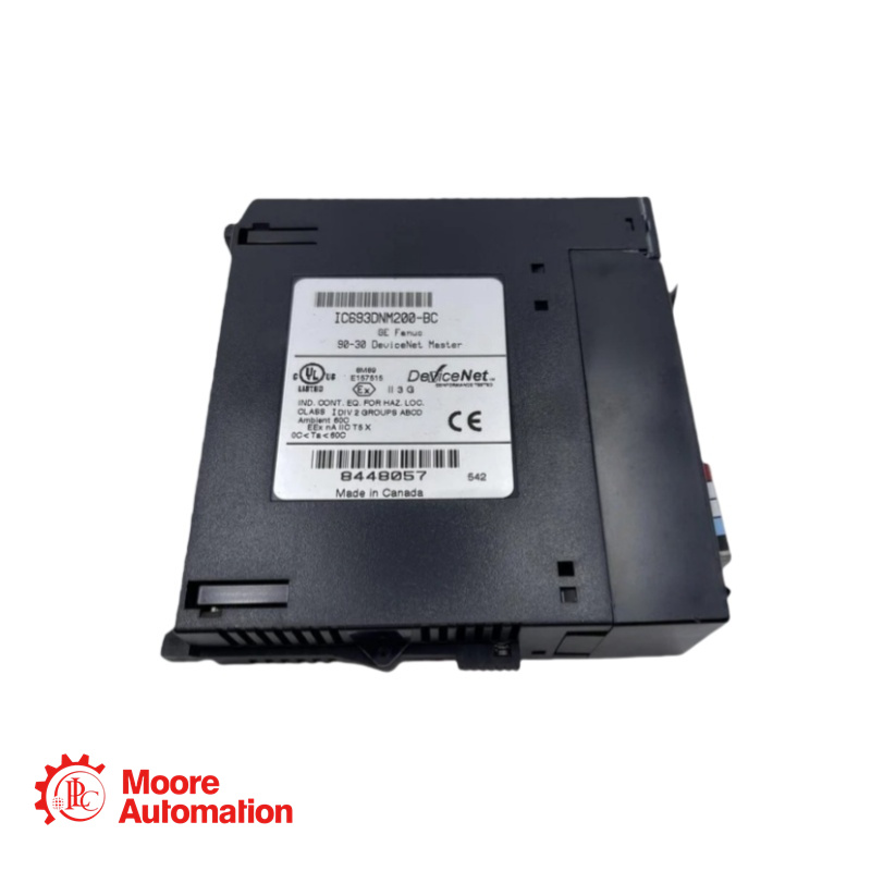 The IC693DNM200-BC is a Series 90-30 component that is manufactured by GE Fanuc. This is a single-slot DeviceNet Master Module with One (1) DeviceNet terminal and One (1) RS232 Service port. This module supports standard DeviceNet transmission rates such as 125K, 250K and 500K and capable of 255 input data bytes and 255 output data bytes and capable of accommodating up to 63 DeviceNet slaves.