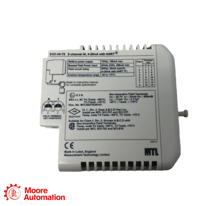 MTL 8101-HI-TX คือโมดูลอินพุตอะนาล็อกที่มีความน่าเชื่อถือสูง ออกแบบโดย MTL Instruments ผู้ให้บริการโซลูชันด้านความปลอดภัยและเครื่องมือวัดอุตสาหกรรมชั้นนำ โมดูลนี้ออกแบบมาโดยเฉพาะสำหรับสภาพแวดล้อมอันตรายและอุตสาหกรรม มีความเชี่ยวชาญในการรับสัญญาณอะนาล็อกจากอุปกรณ์ภาคสนามอย่างปลอดภัยและแม่นยำ จึงเป็นส่วนประกอบสำคัญในระบบควบคุมและตรวจสอบกระบวนการ