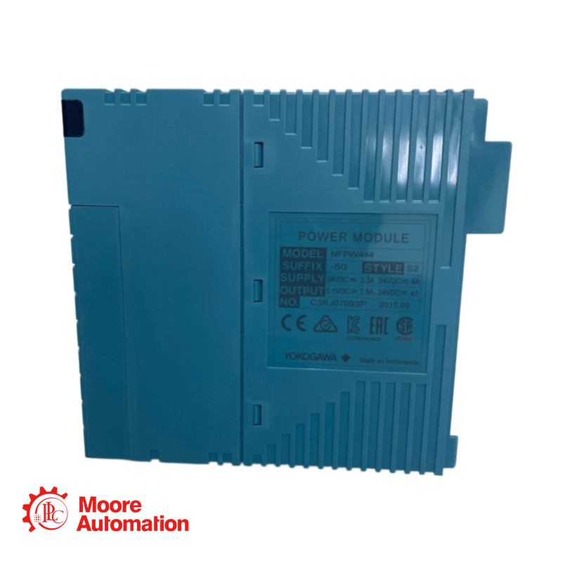 The NFPW444-50 is a power supply module mounted on the NFBU050 (short) or NFBU200 (long) base module. It provides 5 V DC system power and 24 V DC analog field power for additional I/O modules. The module supports duplex (redundant) configuration when installed on the NFBU200 base module. Low heat dissipation eliminates the need for a fan.