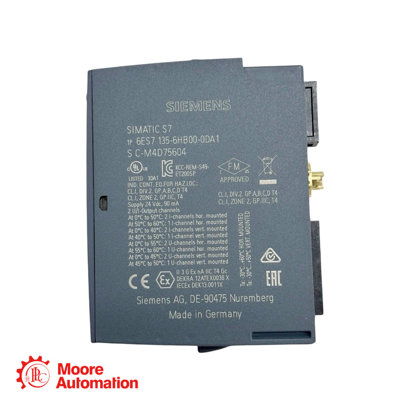 The article number is 6ES7135-6HB00-0DA1. This identifies it as a SIMATIC ET 200SP analog output module with 2 channels for voltage/current, high-speed version.